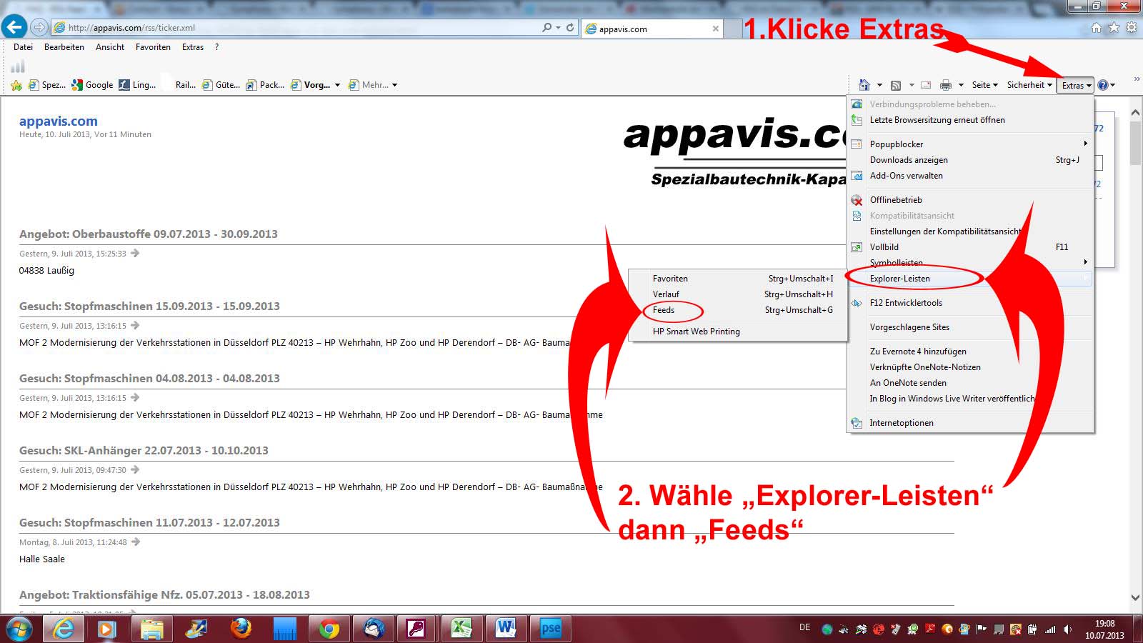Klicken Sie zum Einrichten auf Extras > Explorer-Leisten > Feeds.