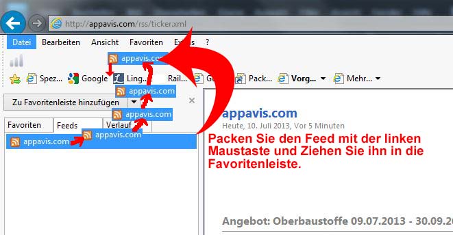 Ziehen Sie den Feed von dort (linke Maustaste) in die Favoritenleiste, so dass Sie künftig mit einem Klick Zugriff auf alle Einträge haben.