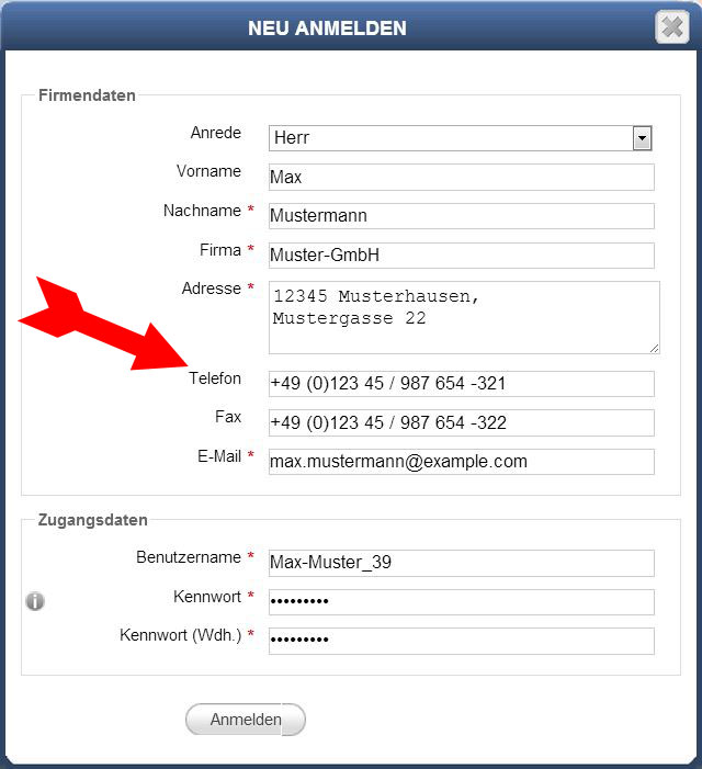 und füllen Sie die Abfragefelder im sich öffneden Dialog NEU ANMELDEN aus.