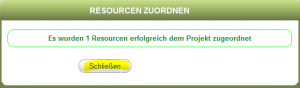 Für Ihre Kontrolle öffnet sich nochmals das Dialogmenü Projektresourcen verwalten, in dem nun Ihre zum Projekt gewählte Resource tabellarisch angezeigt wird. Auf das Dialogmenü Projektresourcen verwalten wird im Folgenden näher eingegangen.