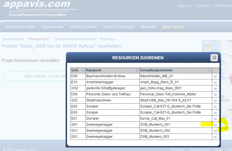 Es öffnet sich der tabellarische Dialog RESOURCEN ZUORDNEN, aus dem Sie nun durch Auswahl Ihre Leistungseinheit (als Resource) Ihrem Projekt zuordnen. Klicken Sie anschließend auf Übernehmen.
