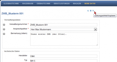 Wenn Sie mehrere ähnlich geartete Leistungseinheiten bzw. -Maschinentechnik besitzen, müssen Sie nicht jede Leistungseinheit separat neu einpflegen, sondern können nach dem abschließenden Speichern der eingepflegten Daten die Leistungseinheit kopieren und so eine weitere Leistungseinheit generieren.
